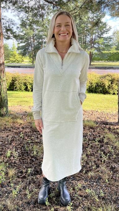 Hemsedal kjole Cream melange er elegant og stilig, samtidig som den fungerer som en deilig kosekjole. Den har fin lengde uansett høyde, med dekorative kontraster i sømmer, glidelås og mansjett. Makeløs fokuserer på å bruke alt vi produserer av stoff, og denne kjolen laget av overskudd fra en tidligere produksjon.